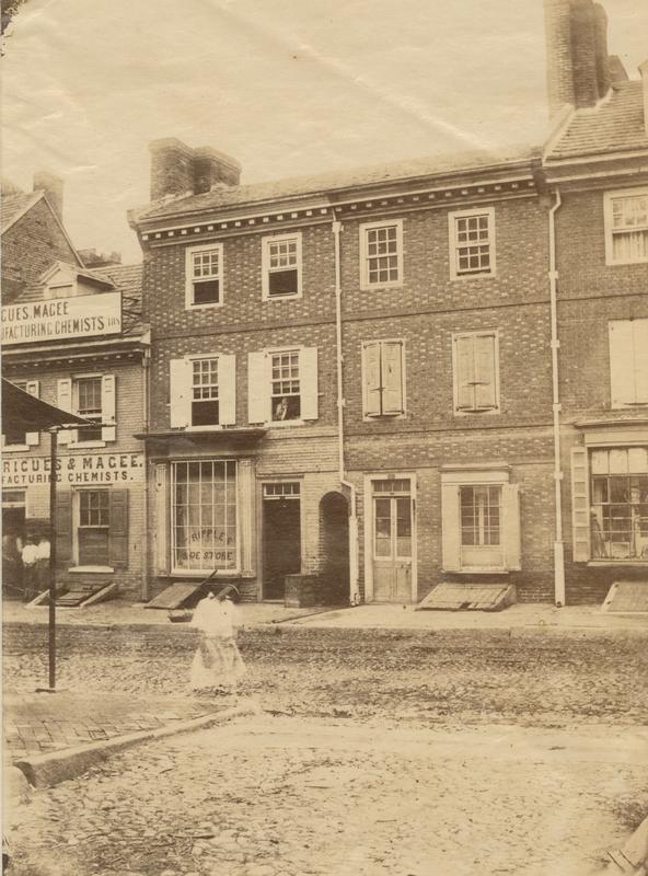 View showing the westside of the 100 block of North Fifth Street. Businesses include Garrigues & Magee, manufactuers of photographic and daguerrian chemicals (108 N. 5th); Tripple's Shoe Store (110 N. 5th), and William Seefeldt, musical instrument store (114 N. 5th). Several musical instruments are displayed in the window of the musical instrument store. Magee, a photographer, operated his chemical business circa 1857 to the early 1890s.