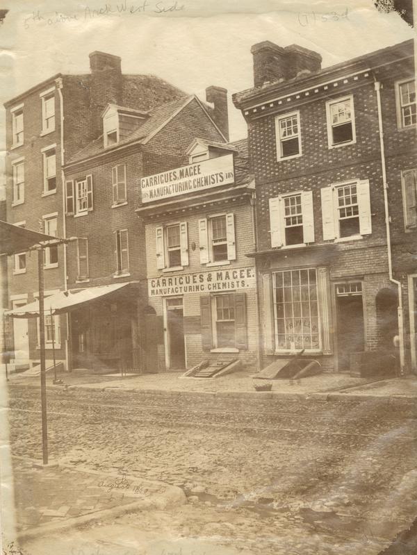 View showing the westside of the 100 block of North Fifth Street. Businesses include Garrigues & Magee, manufacturers of photographic and daguerreian chemicals (108 N. 5th) and Tripple's Shoe Store (110 N. 5th). Also shows the shadow figure of a peddler standing on the sidewalk near his basket in front of the shoe store. Magee, a photographer, operated his chemical business circa 1857 to the early 1890s.