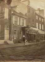 View looking south on Fourth Street, including Daniel Donnelly's tavern (310 S. 4th). Three men stand near the entranceway of the tavern. Also shows the adjacent business, "Browning's new cheap store," possibly the cigar store of Ellen Browning. Browning tenanted 315 S. 4th Street in 1858.