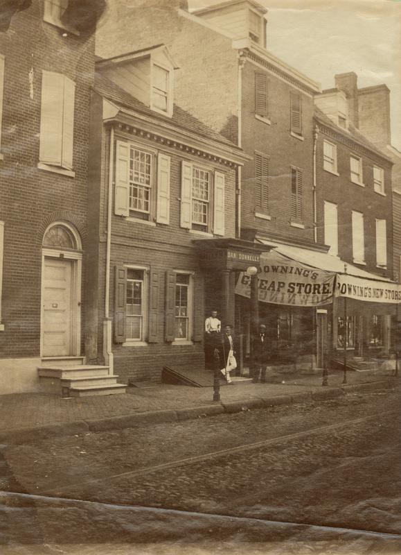 View looking south on Fourth Street, including Daniel Donnelly's tavern (310 S. 4th). Three men stand near the entranceway of the tavern. Also shows the adjacent business, "Browning's new cheap store," possibly the cigar store of Ellen Browning. Browning tenanted 315 S. 4th Street in 1858.