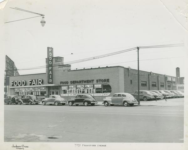 Real estate photograph commissioned by the Jackson-Cross Company depicting Food Fair, a one story, brick grocery store on Frankford Avenue. Sale fliers cover the front windows and advertise "Stokely Week". Automobiles line the Avenue and the parking lot in the foreground.