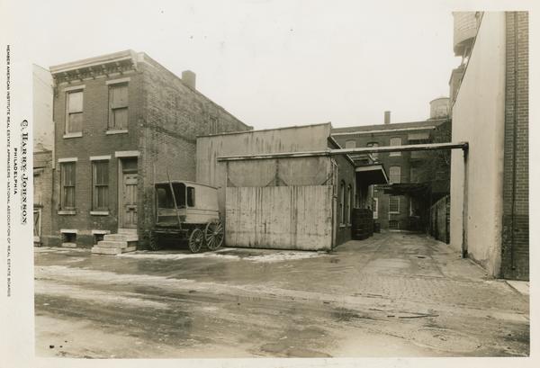 Real estate photograph commissioned by the Jackson-Cross Company depicting the outbuildings in the rear of a factory on the 1200 block of Carpenter Street, viewed from Montrose Street. Includes partial views of two water tanks on top of the factory buildings. An old covered delivery wagon is parked next to a two story brick dwelling.
