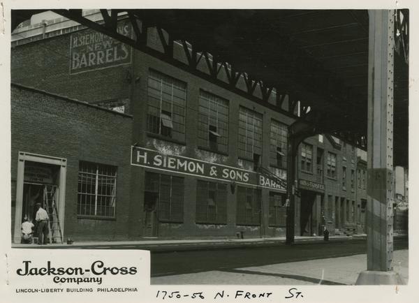 Real estate photograph commissioned by the Jackson-Cross Company depicting the large brick warehouse of H. Siemon & Sons Barrels on North Front Street, near Palmer Street. Includes two men painting the entrance door to the neighboring chemical company at 1746-48 North Front Street. The skeleton of the elevated railroad is visible.