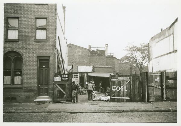 Real estate photograph commissioned by the Jackson-Cross Company depicting several African American laborers working in a coal, ice, and scrap lot for sale by Arthur Boswell in the Spring Garden neighborhood. In the center, an African American man, attired in a brimmed hat, a collared, zipped up jacket, an apron tied around his waist, pants, and shoes, leans on the open wooden door with signs that read, “Sale Arthur Boswell” and “Ice never fails.” The other wooden door has “coal” written in paint. In the scrapyard, several men moving material are visible. Planks of wood lie in piles on the ground. The Jackson-Cross Company, established around 1876, was a Philadelphia real estate firm in operation until 1998.