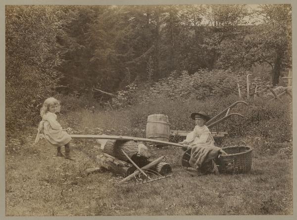 Depicts two young girls sitting on a seesaw made of a board of wood, balanced on logs in a field. Two baskets and a wheelbarrow