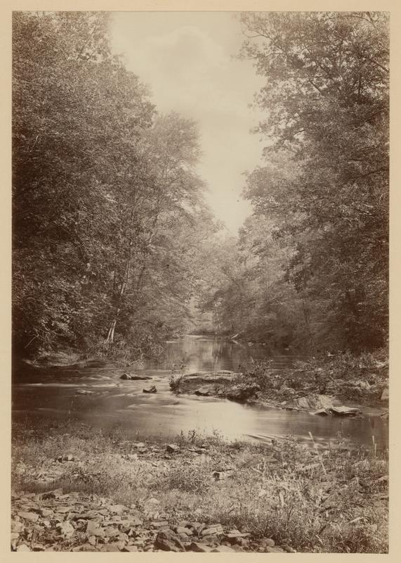 Depicts rocks in and surrounding a tree-lined creek.