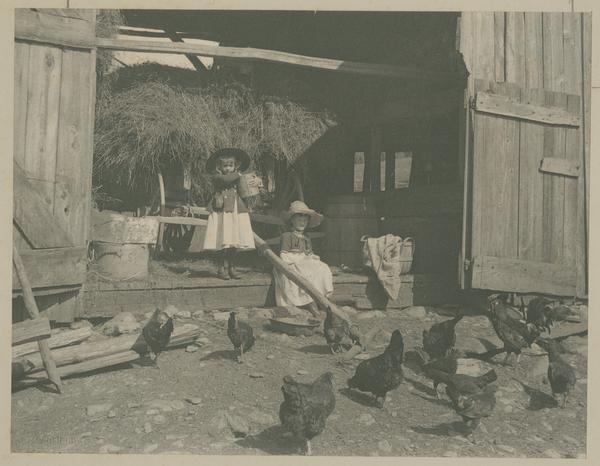 Depicts two young girls feeding chickens at the entrance of a barn. One girl stands poised with her hand in a metal pail of chicken feed, ready to disperse it to the chicken at her feet. Another girl sits on the step leading into the barn. A large pile of hay sits on a cart behind them.