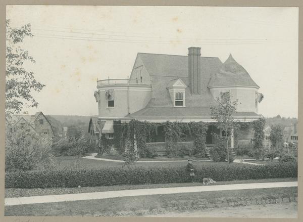 Dog and young boy in front of the photographer's home in Wayne. In the background, the asymmetrical stone house is depicted from the street, showing a projecting two-story oval-shaped wing topped by a balustrade. Shingles unite the bell-shaped roof of the opposite corner wing with the hipped roof of the central body. The front of the house is shaded by a wide, ivy-covered porch and striped awnings cover each of the windows. A large brick chimney rises from the house, near the front entrance.