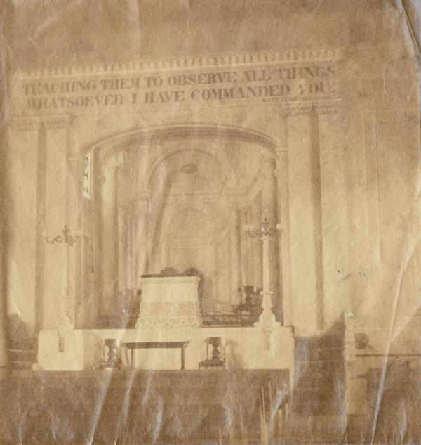 Shows the altar of the Baptist church built 1856 in West Philadelphia. Also shows a partial view of pews and a proverb inscribed above the the altar reading "Teaching Them To Observe All Things Whatsoever I Have Commanded You."