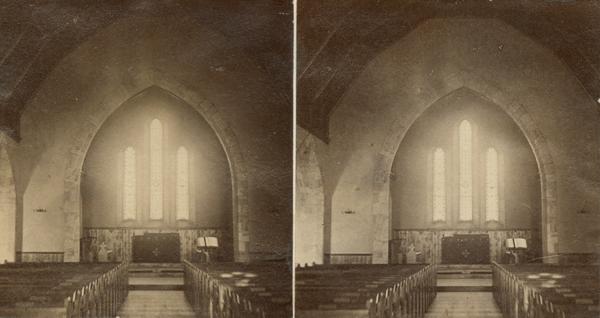 Interior views of the church built 1859-1860 at 222-242 High Street. Shows the triplet stained-glass window designed by Lavers