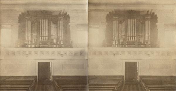 the organ gallery, and pews. Also includes a clergyman, presumably Rev. M.A. DeWolfe Howe, in his clerical robes standing