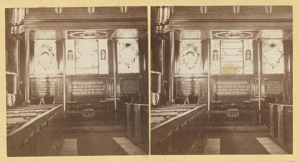 Arcadia caption text: This 1860 view of the organ loft and altar, without a pulpit, at the east end of St. Peter’s Church