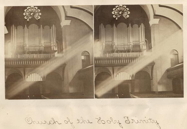 the designs of John Notman. Views show the altar, baptismal fount, organ gallery, pews, and a stain-glass window. Images include