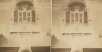 Shows the altar, organ gallery, and pews of the church built in 1823. Views include a wall clock. Congregation, formerly the