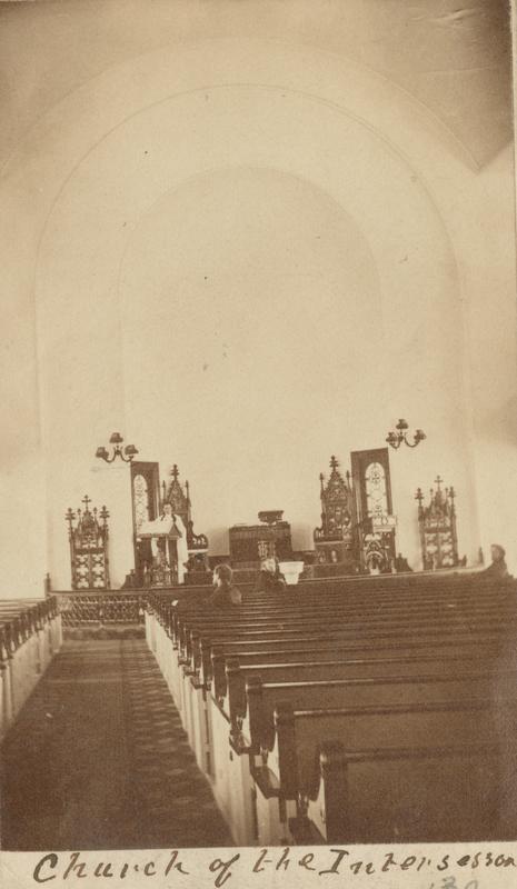 Interior views showing the altar of the Protestant Episcopal church built 1859-1860 after the designs of Stephen P. Rush.