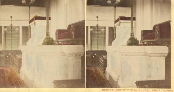 Interior view showing the side of the altar of the church built 1833 after the designs of Thomas Ustick Walter at the southeast corner of Eighth and Cherry streets.