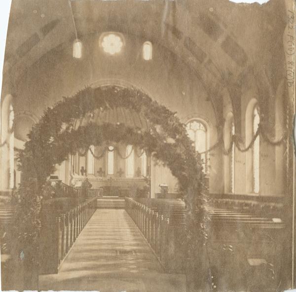 View from back of sanctuary looking up central aisle toward altar. Church is decorated with garlands, including a garland arch. Church constructed between 1855 and 1859 after the designs of Philadelphia architect John Notman.