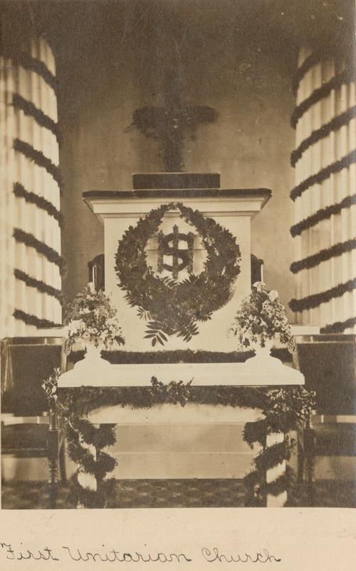 Interior view of the east end of church showing the altar decorated with garlands, a wreath, and vases of flowers. Designed by Philadelphia architect William Strickland, the church was constructed in 1828 at the northeast corner of 10th and Locust Streets and demolished in 1885.