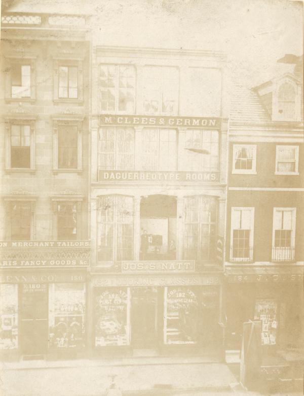 Exterior view of the studio located on the south side of Chestnut Street between 7th and 8th Streets showing the two daguerreotypists posed in a large open window with a camera and screens. View also shows the lower tenant, Joseph S. Natt's looking glass shop; partial views of adjacent businesses, including a fancy goods store (180 and 184 Chestnut); and displays of merchandise in the shop windows. The partnership between James E. McClees and Washington Lafayette Germon lasted from 1846 to 1855, and was located at this address from 1851 to 1853.