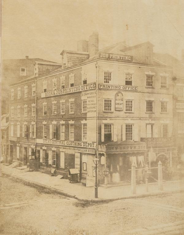 View showing the house owned by Jacob Graff in which Thomas Jefferson wrote the Declaration of Independence in 1776. Signage covers the building advertising current tenants, including B. Crawford's wholesale retail fashionable clothing emporium; William Hicks, tailor; William Brown, clothing; and D.E. Thompson's Book and Job Printing Office. Also shows adjacent businesses, including William Jordan's Shoe Warehouse at 232 Market Street(pre-consolidation). The building was razed circa 1883.