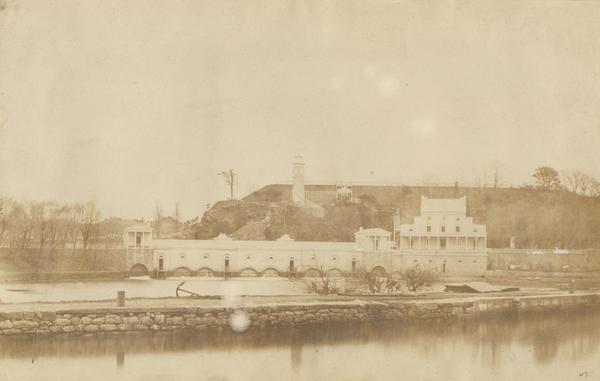 View of the Schuylkill Canal lock in front of the Fairmount Water Works. Shows the old engine house, mill house, and standpipe on Reservoir Hill of the waterworks. Also shows an anchor on the lock. Canal and lock constructed in 1820 following an agreement between Philadelphia and the Schuylkill Navigation Company (incorporated 1815) for the city to build the system in return for constructing a dam and receiving the water rights to the water works.