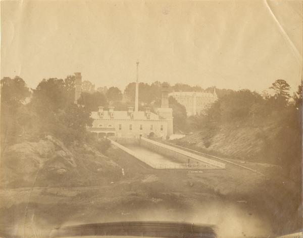 View showing the rear of the engine house at the Schuylkill Water Works (formerly the Spring Garden and Northern Liberties Water Works) at the foot of Thompson Street on the Schuylkill River. Also shows the water basin of the waterworks lined by a fence in the foreground. The waterworks, completed circa 1845 after the designs of engineer William E. Morris, provided water to the Spring Garden, Northern Liberties, and Kensington neighborhoods.