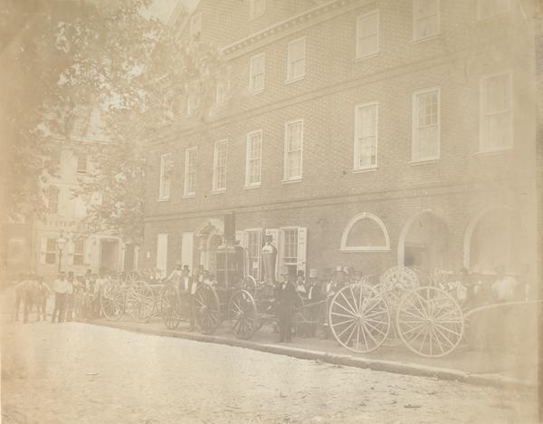 Includes spectators and a partial view of an "Oyster Depot" in the background. Fire station was former mansion of gentlewoman Mary Gurney. Hope Hose Company, also known as Hope Hose and Steam Fire Engine Company, was founded on August 17, 1805.