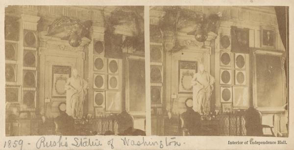 View showing William Rush's wood statue of George Washington (carved 1815, installed 1824) in the Assembly Room of the State House. Also shows framed portrait paintings, predominately from the Charles Wilson Peale collection; a framed commemorative print in honor of the Declaration of Independence; a bronze eagle; a clock; and partial views of Thomas Sully's portrait painting of Lafayette and chairs adorning the room.