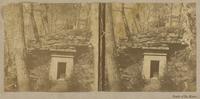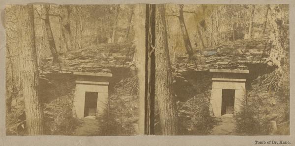 Shows the Kane family hillside vault including the remains of Philadelphia Arctic explorer Elisha Kent Kane. Laurel Hill cemetery was built 1836-1839 after the designs of John Notman.