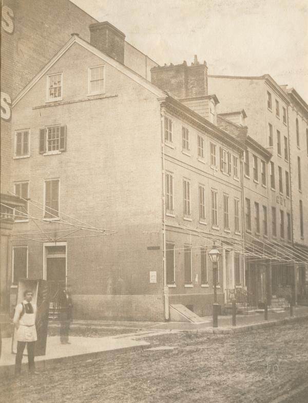 Exterior view of the residence on South Seventh Street between Market and Chestnut streets. Also shows adjoining building and a store clerk standing in in the street to the left of the image.