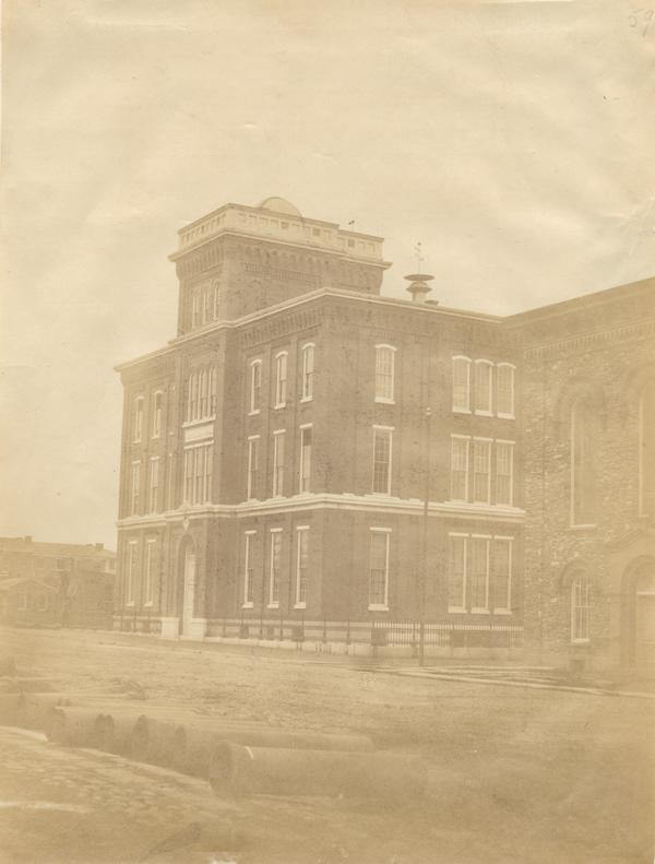 View looking northeast showing the second building of the Central High School for Boys (established 1838), the first public high school in the city, built 1853 at North Broad and Green streets. Also shows adjacent buildings and several large pipe sections in the street in the foreground. Building housed the school until 1900.