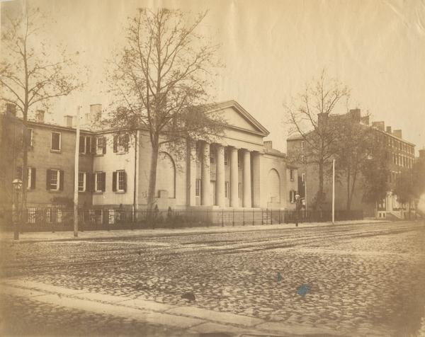 View looking northwest showing the building constructed 1824-26 after the designs of John Haviland at 320 South Broad Street. View includes street railroad tracks, street lamps, and adjacent residences. The school, incorporated in 1821, provided instruction in trades and manufactures to deaf and mute persons.