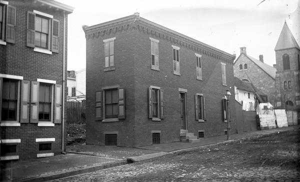Depicts the west side of the 4500 block of Franklin Street, currently Griscom Street, focusing on a two-story brick structure, which sits next to "Grandmother's Alley," an alleyway leading to the Frankford Friends Meeting House from Frankford Avenue. The clock tower of the Central Methodist Episcopal Church is visible in the background. The church was constructed in 1869 for the Seventh United Presbyterian Church. The Central Methodist Episcopal Church purchased the property ca. 1877 when the new church for the Seventh United Presbyterian Church was constructed at the southeast corner of Orthodox and Leiper streets.