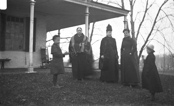 Depicts Mabel C. and Horace D. Webster, the children of the photographer's brother, Albert Webster (1850-1913), playing ball on the lawn in front of Stouton, the former country seat of William MacPherson, owned by the Webster family since 1805. The photographer's mother, Lydia S. Webster, his sister, Mary S. Webster, and his sister-in-law, Anna D. Webster, stand together in the background.