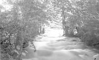 Two groups of men and women stand on opposite sides of a small creek, looking toward the photographer. Bertha T. Webster, wife of Clement B. Webster, stands on the right side. Possibly near Mount Equity in Pennsdale, Pa.