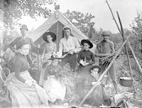 Depicts five women and three men setting up a campsite. A tent is pitched behind them and a woman is preparing a fire underneath
