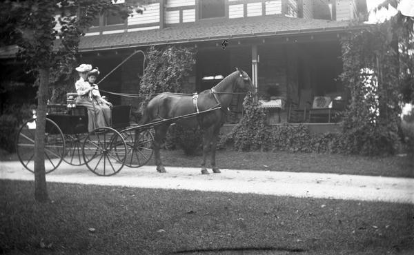 Depicts the photographer's wife, Jane Lownes Webster, sitting in a horse-drawn buggy, next to an unidentified woman who controls the whip and reigns. One horse is harnessed to the buggy, which sits in the stone drive in front of an unidentified house.