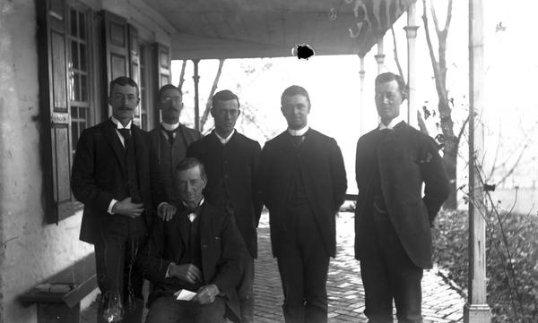 Depicts the five sons of John Hambleton Webster, standing in ascending age order from left to right behind their seated father near the front entrance of Stouton, the former country seat of William MacPherson, owned by the Webster family since 1805. From left to right: Clement B. Webster, John H. Webster, Jr., Howard Webster, George S. Webster, and Albert Webster.