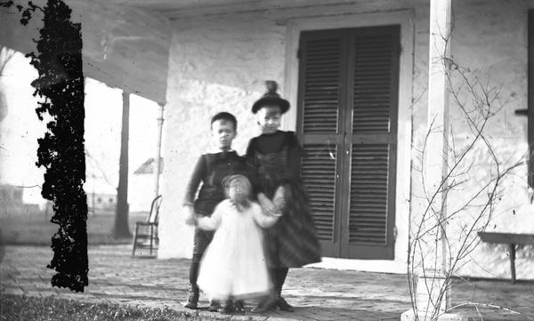 Depicts Mabel C. and Horace D. Webster, the children of the photographer's brother, Albert Webster (1850-1913), standing with an unidentified toddler in front of Stouton, the former country seat of William MacPherson, owned by the Webster family since 1805.