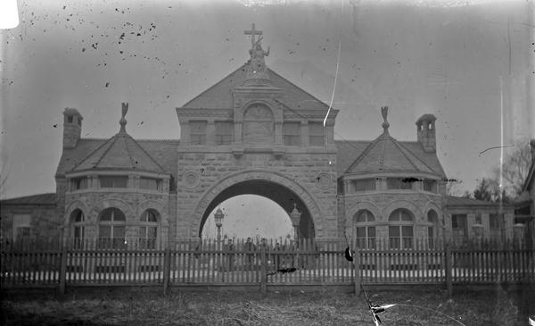 Depicts the rusticated stone arch entranceway to Most Holy Redeemer Cemetery, situated between two rectangular wings with projecting bay windows. The central tower rises above the two wings and is capped by a pyramidal roof. Shingles unite the taller central block with the shorter wings. Constructed by John Jerome Deery in 1887.
