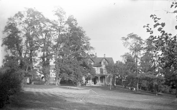 Depicts Mount Equity and surrounding property from a distance. A tennis net is set up in the field in front of the house and a group of people are gathered, probably weaving branches for baskets or brooms. Mount Equity was rented by the photographer's aunt, Hannah Mary S. Taylor, during the summer months of 1889 and 1890.