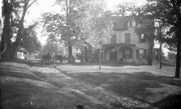 Exterior view of Mount Equity and surrounding property, including three carriages on the stone drive near the house. Bertha T. Webster, wife of the photographer's brother Clement, stands on the front lawn of the house, looking at the carriages. Mount Equity was rented by the photographer's aunt, Hannah Mary S. Taylor, during the summer months of 1889 and 1890.