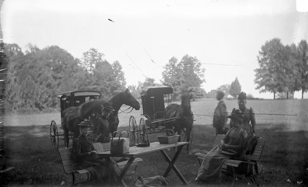 Depicts four women sitting on the wooden benches that flank a picnic table in a field. On the left side, the photographer's wife, Jane L. Webster, sits with an unidentified woman, and on the right, the photographer's older sister, Mary S. Webster, sits next to Bertha T. Webster. Picnic baskets rest on the table, along with a pair of shoes. Two horse-drawn buggies are lined up side by side in the background.