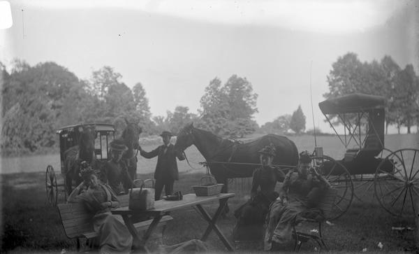Depicts four women sitting on the wooden benches that flank a picnic table in a field. On the left side, Bertha T. Webster sits with an unidentified woman and on the right, the photographer's older sister, Mary S. Webster, sits next to the photographer's wife, Jane L. Webster. Picnic baskets rest on the table, along with a pair of shoes. A man holds the reigns of two horse-drawn buggies in the background.