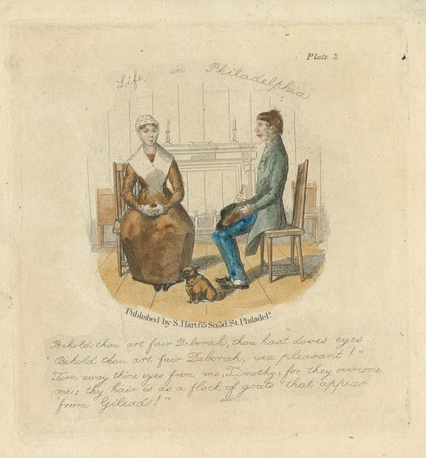 Caricature satirizing the manners of Quakers and depicting a white Quaker couple, Deborah and Timothy, courting in front of