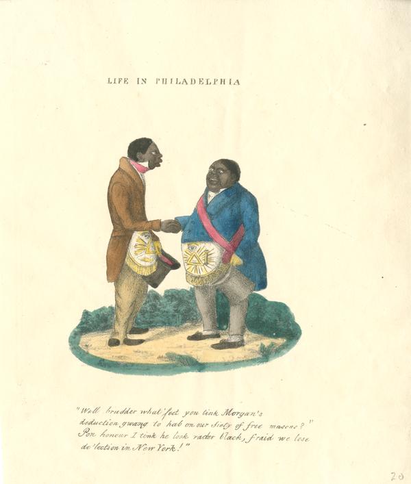 Racist caricature depicting two African American masons in regalia, shaking hands, and discussing the abduction of William