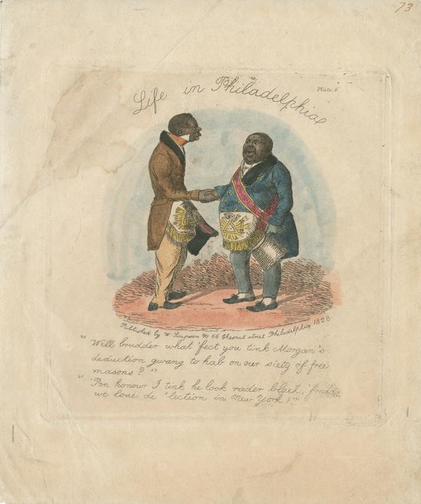 Racist caricature depicting two African American masons in regalia, shaking hands, and discussing the abduction of William