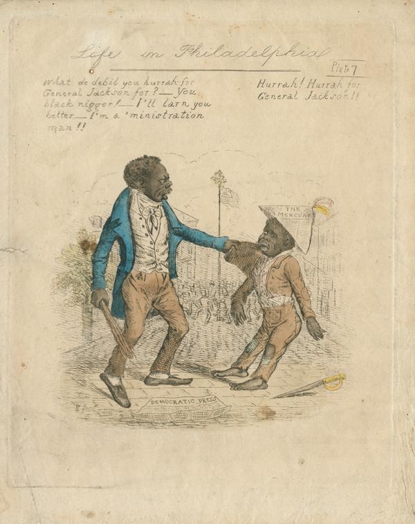 Racist caricature of an African American "’ministration man" (supporter of incumbent John Quincy Adams) aggressively chastising an African American boy for his cheers of support for the new President, Andrew Jackson. Depicts, in the left, a man attired in a blue waistcoat, white vest, white cravat, tan pants, and tan slip on shoes holding a switch in his right hand and angrily grabbing the boy who has a frightened look on his face and is barefoot. The boy is dressed in patched tan pants, a tan jacket with an elbow patch, a white vest and a hat made from the pro-Jackson paper "The Mercury." A sword lays beside the boy and a copy of the anti-Jackson paper "Democratic Press" lays in front of the man. In the background, cityscape is visible and a large crowd is seen celebrating Jackson’s election around a flag pole. The figures are portrayed with oversized and exaggerated features. Their skin tone is depicted with black hand coloring.