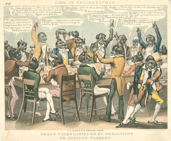 Racist caricature about free African Americans' celebratory response to the abolition of the African slave trade by the United