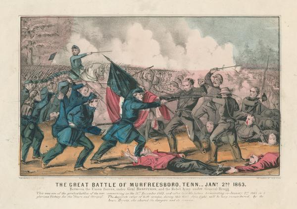 The great battle of Murfreesboro, Tenn. _ Jany. 2nd 1863. Between the Union forces, under Genl. Rosecrans, and the rebel army under General Bragg. [graphic] : This was one of the greatest battles of the war commencing on the 31st December 1862 and after terrible losses terminating on January 2nd 1863 in a glorious victory for the "Stars and Stripes." The desperate valor of both armies during this three days fight will be long remembered, by the brave heroes, who shared its dangers and its renown.